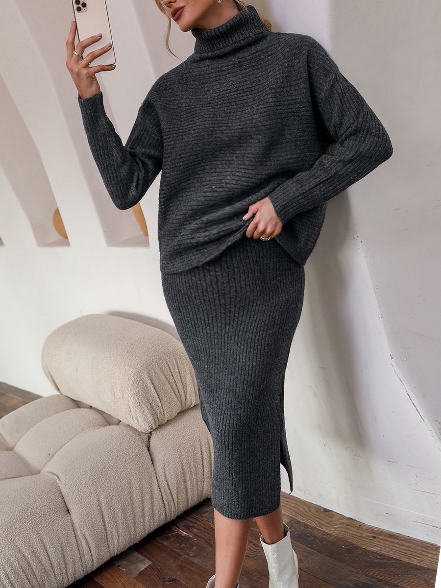 Maternity Elegant High-neck Knit Sweater Slit Under Skirt Two-piece Set